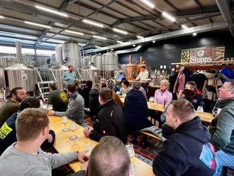In Steinbach angekommen, wurden die Ebenshäuser herzlich von den Mitarbeitern der Brauerei begrüßt und auch sogleich in die „Heiligen Hallen“ geführt. Bei frischen Brötchen und leckeren Wurstwaren von einer der fünf regionalen Metzgereien, wurde das erste frisch gezapfte Zwickel verkostet. Es folgten spannende Einblicke in die moderne Technologie der Braukunst, die eingesetzten Rohstoffe sowie die regionale Vermarktung. Schnell wurde klar, dass hier ein bierbegeistertes Team am Werk ist, welches auf regionale Rohstoffe setzt, um die althergebrachte Brautradition im Messerdorf Steinbach zu erhalten. Mit Leidenschaft und Hingabe sorgen die drei Gesellschafter der Brauerei für guten Geschmack und bringen mit ihrem „Rotbier“ und dem „Sommerbier“ auch ausgefallene Kreationen, welche insbesondere den nicht-biertrinkenden Frauen der Reisegruppe mundeten, auf den Markt. Neben der Brauereibesichtigung fanden angeregte Gespräche statt und man genoss das gemütliche Beisammensein. Schließlich erreichte Ebenshausen im vergangenen Jahr den zweiten Platz im Regionalwettbewerb „Unser Dorf hat Zukunft“ und bereitet sich nun auf den großen Auftritt auf Landesebene vor. Da kann es nicht schaden, sich ein paar Tipps und Anregungen von den erfahrenen Steinbachern zu holen.