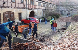 Die 9. Klassen waren dabei auf dem Hof des Roten Schlosses im Einsatz. Altes Laub, Äste und Unrat wurde in Container geladen. Drei waren es zum Schluss, die vom Bauhof abtransportiert und entsorgt wurden.