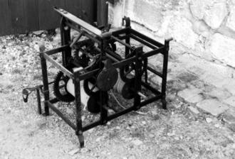 Das aus dem Jahr 1891 stammende Uhrwerk der Kirchturmuhr vor dem Wiedereinbau[8].