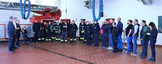 Stadtbrandmeister Thomas Andres, Wehrführer Markus Mayer und Bürgermeister Rainer Lämmerhirt erläuterten den versammelten Kameradinnen und Kameraden, wie es zur Entstehung der Werkstatt gekommen ist.