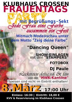 | Zur großen Frauentagsparty heißt es: „Jede Frau eine Farbe - zusammen ein Fest!“ Denn die Welt der Frauen ist bunt - und du bist ein wichtiger Teil davon. Freut euch auf einen Abend voller Farbe, Musik, Lebensfreude und echter Gemeinschaft. Ob jung oder reif, von nah oder fern, endlich geht es wieder los! Mit DJ Paule, den „Dancing-Queens“ und den Line-Dancern „Stampers“ ist beste Stimmung garantiert. Kulinarisch verwöhnt euch die HWK-Kantine, während die Jungs vom Kulturverein Crossen zuverlässig dafür sorgen, dass keine Kehle trocken bleibt. Die Fotobox hält eure schönsten Momente fest - Lächeln ausdrücklich erwünscht! Also Mädels: Kramt euer Lieblingsfarben-Outfit raus und macht unsere Modenschau so bunt wie wir Frauen selbst. Reservierte Karten bitte bis Dienstag, den 03.03.26, im Klubhaus abholen - ein paar letzte Restkarten warten noch auf euch Mädels. |
