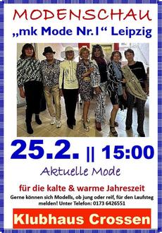 | 15:00 | Humoristische Modenschau mit Mode Nr. 1 mit Ein und Ausblicken auf Frühjahr- und Sommermode. Du wolltest schon immer mal auf dem Laufsteg gehen - dann einfach bei uns anmelden und mitmachen. Es macht riesigen Spaß! |