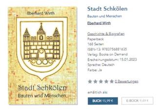 Herr Eberhard Wirth, der bereits einige Führungen durch die Stadt Schkölen durchgeführt hat und uns einiges spannendes über die Geschichte der Stadt erzählt hat, verfasste sein Wissen in einem Buch: Stadt Schkölen. Bauten und Menschen. Sie können dieses Buch unter der ISBN-Nummer: ISBN-13: 978-3756881635 erwerben+. Das Buch kostet 15,99 EUR oder 9,49 EUR (E-BOOK).