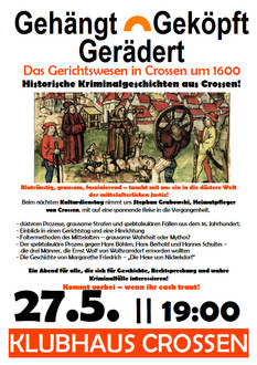 | Das Klubhaus wird zur Bühne für dunkle Kapitel der Geschichte: Heimatpfleger Stephan Grabowski entführt euch beim Kulturdienstag in die Welt mittelalterlicher Gerichtsbarkeit. Unter dem Titel „Gehängt, Geköpft, Gerädert - Das Gerichtswesen in Crossen“ erwarten euch wahre Kriminalgeschichten aus dem 16. Jahrhundert - von grausamen Strafen über Foltermethoden bis hin zu spektakulären Prozessen. Mit dabei: Der Mordplan gegen Ernst Wolf von Wolfsramdorf und die Geschichte der „Hexe von Nickelsdorf“. Ein Muss für alle, die sich für Geschichte, Recht und echte Kriminalfälle begeistern. Kommt vorbei - wenn ihr euch traut! |