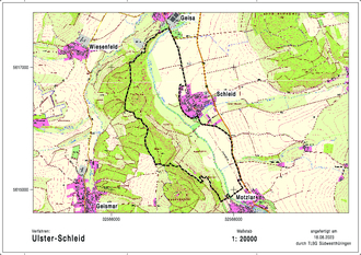 Um den Zweck der Flurbereinigung möglichst vollkommen zu erreichen, wurde das Flurbereinigungsgebiet, wie in der Anlage 1 beschrieben, abgegrenzt. Die Abgrenzung wurde so gewählt, dass sich die Ulster etwa mittig im Verfahrensgebiet befindet. Die Verfahrensgrenze orientiert sich dabei vorrangig an in der Örtlichkeit vorhandenen Wegen und Straßen sowie an der Gemarkungsgrenze.
