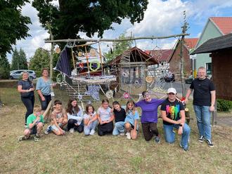 Es wurde gehämmert, geschraubt, gewebt. Dabei entstand ein großes Webbild, welches nun den Platz neben der Bushaltestelle ziert. Auch Spiel und Spaß kamen nicht zu kurz, sodass die Woche wie im Flug verging. Am Ende gab es eine kleine Einweihungsparty, wo den Eltern und der Ortsteilbürgermeisterin voller Stolz das Kunstwerk präsentiert wurde.