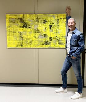 Das Foto zeigt den Aussteller neben seinem Bild „Yellowstone“.