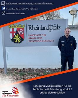 Vom 23.-27.02.2026 besuchte Dr. Jens Dudenhöffer, Zugführer in der Einheit Rülzheim, den Lehrgang "Multiplikatoren für die Technische Hilfeleistung Modul 2“ am Landesamt für Brand- und Katastrophenschutz Rheinland-Pfalz (LfBK) in Koblenz. Ziel des Lehrgangs war die Befähigung zur Durchführung von theoretischen und praktischen Übungen im Bereich Technischer Hilfe. Inhalte waren: