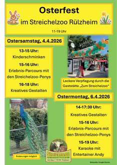 Am Ostersamstag, 04.04.2026, und Ostermontag, 06.04.2026, findet unser Osterfest im Streichelzoo statt. Von 11:00 - 19:00 Uhr warten bunte Aktionen auf unsere kleinen und großen Besucherinnen und Besucher. Am Samstag findet von 13:00 - 15:00 Uhr das Kinderschminken statt. Von 15:00 - 16:00 Uhr könnt ihr gemeinsam mit unseren Ponys einen Erlebnis-Parcours meistern. Von 16:00 - 18:00 Uhr kann kreativ gestaltet werden. Am Sonntag findet das kreative Gestalten von 14:00 - 17:30 Uhr statt. Von 15:00 - 16:00 Uhr könnt ihr gemeinsam mit unseren Ponys den Erlebnis-Parcours durchlaufen und euch von 15:00 - 19:00 Uhr beim Karaoke (Entertainer Andy) vergnügen. Leckere Verpflegung bietet an beiden Tagen unsere Gaststätte „Zum Streichelzoo“.