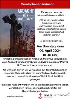 | Rülzheim, | 18:00 Uhr | Andacht für die Verstorbenen der Monat Februar und März |