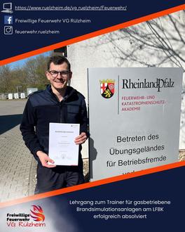 Lucas Leibach, aus der Einheit Rülzheim, absolvierte vom 31.03.-04.04.2025 die Ausbildung zum Trainer für gasbetriebene Brandsimulationsanlagen am Landesamt für Brand- und Katastrophenschutz in Koblenz. Der Lehrgang befähigt die Teilnehmer*innen die Ausbildung zur Innenbrandbekämpfung in gasbetriebenen Anlagen selbständig durchzuführen. Neben Löschtaktiken wird auch der richtige Einsatz von Hohlstrahlrohren gelehrt. Darüber hinaus wird das Atemschutznotfallmanagement geübt und die Organisation und Durchführung des mobilen Trainings besprochen. Lucas hat die Prüfung mit Erfolg absolviert.