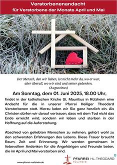 | Rülzheim, | 10:30 Uhr | Amt für die Pfarrei mit Taufe; 18:00 Uhr Andacht für die Verstorbenen der Monate April und Mai | |