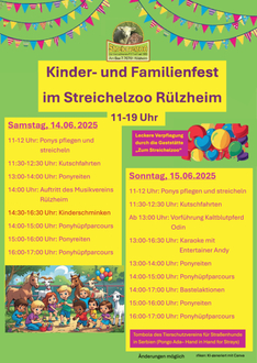 Am Samstag, 14.06. und Sonntag, 15.06.2025, findet unser großes Kinder- und Familienfest statt. Von 11:00 - 19:00 Uhr bieten wir euch zwei bunte Tage mit vielen Aktionen für die kleinen Besucherinnen und Besucher. Es werden wieder einmal schöne Attraktionen angeboten. Lasst euch überraschen! Hier eine erste Übersicht für beide Tage (Sa+So): Kutschfahrten 11:30-12:30 Uhr, Ponyreiten 13-14 & 15-16 Uhr, Ponyhüpfparcours auf dem Reitplatz 14-15 & 16-17 Uhr, Ponys pflegen und streicheln 11-12 Uhr. Für musikalische Unterhaltung sorgt am Samstag ab 14:00 Uhr der Musikverein Rülzheim und am Sonntag von 13:00 - 16:30 Uhr Karaoke Andy. Am Samstag findet von 14:30-16:30 Uhr das Kinderschminken statt und am Sonntag von 14-17 Uhr Bastelaktionen. Odin das Kaltblutpferd gibt am Sonntag ab 13 Uhr eine Vorführung. Garantiert ein Spaß für die ganze Familie! Änderungen / Ergänzungen sowie nähere Informationen werden wir zeitnah via Facebook und hier im Heimatbrief bekannt geben. Wir freuen uns auf euren Besuch!