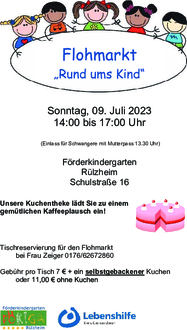 Endlich ist es wieder so weit. Am 09. Juli 2023 findet von 14.00 bis 17.00 Uhr der Flohmarkt „Rund ums Kind“ im Förderkindergarten der Lebenshilfe in Rülzheim, Schulstraße 16 statt. Einlass für Schwangere mit Mutterpass bereits um 13.30 Uhr. Geboten wird alles rund ums Kind. Tischreservierungen können gerne bei Frau Zeiger (0176/62672860) vorgenommen werden. Für Kaffee und Kuchen ist außerdem gesorgt. Das Team des Förderkindergartens freut sich auf Ihr zahlreiches Erscheinen.