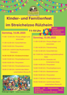 Diesen Samstag, 14.06. und Sonntag, 15.06.2025, findet unser großes Kinder- und Familienfest statt. Es werden zwei bunte Tage voll schöner Attraktionen. Es wird viel geboten! An beiden Tagen finden von 11:30 - 12:30 Uhr Kutschfahrten und von 13:00 - 14:00 Uhr und 15:00 - 16:00 Uhr das Ponyreiten statt. Auf dem Reitplatz gibt es einen Ponyhüpfparcours, der an beiden Tagen von 14:00 - 15:00 und von 16:00 - 17:00 Uhr bespielt werden kann. Samstags und sonntags können die Kinder unsere Ponys streicheln und pflegen (jeweils von 11:00 - 12:00 Uhr). Für musikalische Unterhaltung sorgen am Samstag ab 14:00 Uhr der Musikverein Rülzheim und ab 18:00 – 21:00 Uhr Alleinunterhalter Ronny M. Am Samstag findet zudem von 14:30 - 16:30 Uhr das Kinderschminken statt. Am Sonntag haben die Familien von 11:00 - 14:00 Uhr Gelegenheit, sich bei einem Fotoshooting fotografieren zu lassen. Von 12:00 - 15:30 Uhr sorgt Entertainer Andy mit seiner Karaokeshow für Unterhaltung. Ab 13:00 Uhr zeigt Kaltblutpferd Odin sein Können bei einer Vorführung. Von 14:00 - 17:00 Uhr wird es eine Bastelaktion geben und von 16:00 - 19:00 Uhr tritt Alleinunterhalter Ronny M. erneut bei uns auf. Änderungen im Programm sind möglich. Leckere Verpflegung bietet die Gaststätte „Zum Streichelzoo“. Wir freuen uns auf das Fest und euren Besuch!
