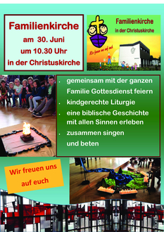 | 10:30 Uhr | Familienkirche in der Christuskirche, Pfr. Jan Meckler u. Team der Familienkirche |
