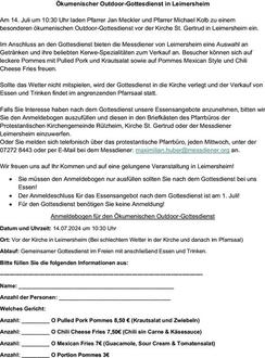 | 14:30 Uhr | Tauferinnerungsgottesdienst auf der Pfarrwiese neben der Christuskirche, Pfrin. Susanne Leingang und Pfr. Jan Meckler |
