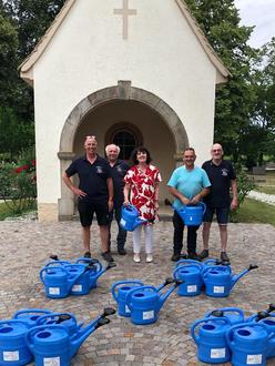 Anlässlich des 45-jährigen Jubiläums der Montagswürfler 1980 Leimersheim spendeten die Montagswürfler in einer Charity-Aktion 20 neue Gießkannen für den Friedhof der Gemeinde Leimersheim. Elke Huber, die Beigeordnete der Ortsgemeinde Leimersheim, und Benedikt Wünschel vom Bauhof Leimersheim nahmen dankend die neuen Gießkannen für den Friedhof entgegen (siehe Bild) und freuten sich über diese unverhoffte Zuwendung, da gerade an heißen Sommertagen verfügbare Gießkannen mit Brauseköpfen oft Mangelware an den Brunnen sind. Die Montagswürfler gedenken mit dieser Aktion vor allem auch an unsere bereits verstorbenen Würfelkameraden Norbert Marthaler (+2019), Horst Ochsenreither (+2012), Ulrich Ochsenreither (+1991) und an unseren verstorbenen Ankerwirt Hubert Schardt (+2015) sowie an unseren langjährigen Gastwürfler Hans-Peter „Jason“ Schwab (+2006). Sie alle bleiben in unseren Erinnerungen unvergessen.
