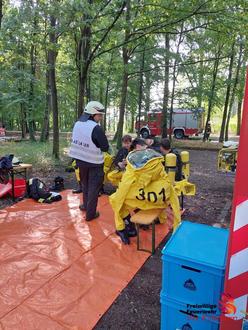 Die Feuerwehr Wörth und der Gefahrstoffzug des Landkreis Germersheim wurde am Mittwochmorgen mit dem Alarmstichwort „Chlorgasaustritt Badepark Wörth“ alarmiert. Vor Öffnung des Bads löste die automatische Überwachungseinrichtung aus. Glücklicherweise war zu dem Zeitpunkt nur Personal auf dem Gelände, das bis zum Eintreffen der Feuerwehr das Bad schon verlassen hat. Die ersteintreffende Feuerwehr Wörth erkundete die Lage und stellte über die vor Ort verbaute Messtechnik eine erhöhte Chlorgaskonzentration in dem Betriebsraum fest, was auf eine Leckage der Anlage hindeutete. Außerhalb des Betriebsraums war keine Konzentration messbar. Chlorgas zeigt ungebundener Form schon in geringen Konzentrationen starke Einwirkungen auf die Atemwege. Durch eine Reaktion mit der Feuchtigkeit der Schleimhäute kommt es bei Kontakt zu einer starken Reizung. Einsatzleiter, Rainer Böser, forderte daraufhin die Einheiten Werkfeuerwehr Daimler Trucks, SEG-V und die Sanitätsbereitschaft Feuerwehr nach. Zur Absicherung der Einsatzkräfte und der angrenzenden Anwohner wurden Wasserwerfer aufgebaut, die den Gebäudeteil mit einer Wasserhülle bedeckte. Durch diese Maßnahme würde austretendes Chlorgas gebunden und die Ausbreitung verhindert werden. Ein Trupp ging unter gasdichten Chemikalienschutzanzügen in den Raum vor und führte Messungen durch. Hierbei wurden keine weiteren Chlorgaskonzentrationen festgestellt. Die Schutzeinrichtung der Anlage hat korrekt funktioniert, indem die Behältnisse automatisch verschlossen wurden und das entwichene Chlorgas durch die Sprinkleranlage restlos gebunden wurde. Gegen Mittag konnte Entwarnung gegeben werden. Eine Gefahr für die angrenzenden Anwohner bestand zu keinem Zeitpunkt. Eingesetzt waren insgesamt 62 Kräfte der Feuerwehr mit 18 Fahrzeugen, die SEG-V, die Sanitätsbereitschaft der Feuerwehr, die Polizeiinspektion Wörth.