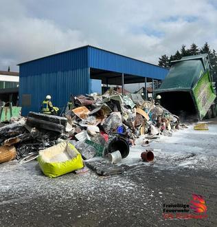 Die Leitstelle alarmierte uns heute Morgen zum ortsansässigen Wertstoffhof. Dort brannte eine 20 Kubikmeter große Müllpresse, die mit Restmüll beladen war. Ein Mitarbeiter der Firma handelte vorbildlich und zog die Presse mit dem LKW auf eine Freifläche. Der Müllcontainer wurde geöffnet und mit dem Löschangriff begonnen. Anschließend wurde der brennende Inhalt abgekippt, auseinandergezogen und mit Schaummittel abgelöscht. Damit das Schaum-/Wasser-Gemisch nicht ungehindert in die Kanalisation gelangt wurde ein Schmutzwasserablauf auf dem Gelände geschlossen. Ebenfalls vor Ort war der Rettungsdienst, die Sanitätsbereitschaft Feuerwehr und die Polizei.