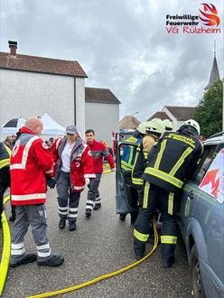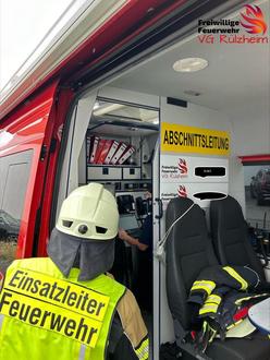 Der Einsatzleiter verschaffte sich ein Lagebild und erkundete die Halle, dabei stellte er eine starke Rauchentwicklung fest. Danach löste er eine Alarmstufenerhöhung auf Rauchentwicklung aus Gebäude – unklar, ob Menschenleben in Gefahr sind, aus. Bei der Erstalarmierung fuhren die Einheit Kuhardt mit dem Kleinlöschfahrzeug, das Löschgruppenfahrzeug, Tanklöschfahrzeug und der Einsatzleitwagen der Einheit Rülzheim an. Durch die Nachalarmierung kamen die Einheiten Hördt und Leimersheim mit den Tragkraftspritzenfahrzeug mit Wasser und die Drehleiter aus Rülzheim hinzu. Je nach Einsatztag, Uhrzeit und Ort wird bei solchen Alarmstichworten die ganze Verbandsgemeinde auf einmal alarmiert. Die Mannschaft des KLFs und LFs kümmerten sich bei der Übung zusammen mit der Sanitätsbereitschaft Feuerwehr, die in Realeinsätzen zur Eigensicherung der Feuerwehrangehörigen dabei ist, um zwei eingeklemmte Personen im PKW sowie um den Traktorfahrer. Die Koordination übernahm der Führungsgehilfe des Einsatzleitwagens zusammen mit den beiden Gruppenführen.