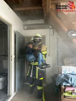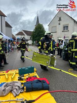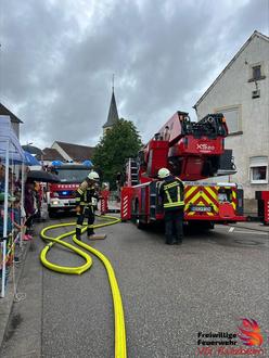 Nachdem die vermissten Enkel alle gefunden waren, wurde der Löschangriff im Gebäude durchgeführt. Eine Riegelstellung zum Nachbargebäude und der angrenzenden Scheunen wurde mit dem Wenderohr der Drehleiter sichergestellt. Zusätzlich erstellte die Drohne ein Lagebild, sodass der Einsatzleiter einen Gesamtüberblick der Einsatzstelle hatte. Das komplette Übungsszenario wurde unter realen Einsatzbedingen und Zeiten erfolgreich abgearbeitet. Unser Kamerad und Geburtstagskind Wolfgang Sinn moderierte die Übung, so erhielten über 60 Zuschauer und politische Vertreter unsere Verbandgemeinde einen Einblick in die einzelnen Arbeitsabläufe und ein besseres Verständnis. Wir möchten uns bei Edwin Götz und seiner Familie bedanken, dass er uns sein Anwesen für die Übung zur Verfügung stellte, weiterhin danken wir Hubert Seelinger, der die Beschallung übernahm, dem Autoservice Lenhard aus Lingenfeld für die regelmäßige Bereitstellung von Fahrzeugen, sowie der Einheit Kuhardt für die Vorbereitung der Übung und des anschließenden kameradschaftlichen Beisammenseins! Vielen Dank an die Bevölkerung, die trotz des Regens Interesse zeigte und unsere Übung anschaute!