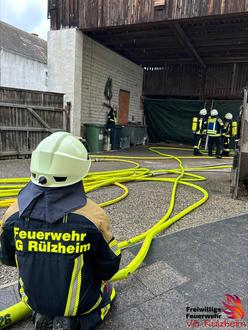 Der Eigentümer des Grundstücks Rheinstraße 5 bemerkte in seiner Lagerhalle eine Rauchentwicklung. Aufgrund dessen versuchte er, seine Landmaschine aus der verrauchten Scheune zu retten. Er manövrierte diese rückwärts aus der Lagerhalle in Richtung Rheinstraße hinaus. Dabei übersah er einen vorbeifahrenden PKW, welcher in die Lastgabeln des Traktors fuhr. Ein vorbeifahrender Verkehrsteilnehmer sah die Unfallstelle und wählte die Notrufnummer 112. Der unter Schock stehende Fahrer des Traktors teilte dem zuerst eintreffenden Gruppenführer mit, dass Rauch aus seiner Lagerhalle komme und er nur seine Landmaschine herausfahren wollte. Außerdem teilte er mit, dass seine Enkel irgendwo auf dem Gelände spielten. Der Gruppenführer des KLFs erteilte den ersten Einsatzbefehl zur Personenbetreuung an seine Mannschaft.