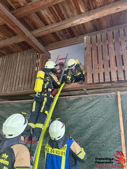Die Mannschaft führte unter Atemschutz die Personensuche im verrauchten Gebäude durch, dazu mussten Steckleiterteile aufgestellt werden, um die verschieden Ebenen zu erreichen und abzusuchen.