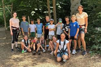 Mia und Hanna berichten vom Ausflug in den Kletterwald: Nachdem wir am 26. Juni im Kletterwald in Speyer ankamen, fanden wir schnell ein schattiges Plätzchen und weil wir so hungrig waren, haben wir direkt was gegessen. Viele Kinder kauften sich noch Handschuhe, damit man nicht abrutscht. Wir bekamen gelbe Bändchen, dass wir unseren Parcours erkennen konnten (Parcours Fitness, Familie, Erlebnis und Abenteuer Junior) und haben unseren Kletteranzug bekommen. Wir schauten einen kleinen Film, damit wir die Regeln wussten. Dann ging es los! Die Parcours hatten ihre eigenen Besonderheiten: Fitness war so besonders, weil er der längste Parcours von den gelben war und es viele Seilbahnen gab. Es gab bei Fitness sogar drei Seilbahnen hintereinander. Kommen wir nun zum Parcours Familie: Dieser Parcours war so besonders und jagte uns einen Schrecken ein, weil wir nicht wussten, dass in der Luft Wippen aus Holz waren. Als Nächstes erzählen wir euch über den Parcours Abenteuer Junior: Besonders war bei ihm, dass direkt am Anfang so etwas wie eine Leiter hochging und wir hatten beide Schiss, als wir diese hochkletterten. Zum Schluss berichten wir euch noch etwas über den Parcours Erlebnis, der zwar ein bisschen kurz war, aber dennoch Spaß gemacht hat. Als wir fertig waren, haben wir ein Foto gemacht und ein Eis gegessen. Leider mussten wir dann schon losfahren. Geklettert wie die Affen sind Hanna, Mia, Emi, Marla, Vicky, Luca, Jakob, Josha, Mats, Michael, Alex, Finn und Yehor sowie Frau Bentz und Frau Horn.