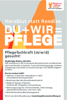 Seit dem 01. Juli sind Besuche in der Braun’schen Stiftung von 9.00 Uhr bis 20.00 Uhr möglich. Der Zutritt erfolgt auch weiterhin ausschließlich über den Haupteingang am Hauptgebäude. Gemäß der Landesverordnung vom 25.06.2022 sind Besuche in Pflegeeinrichtungen weiterhin für alle Besucher*innen (auch geimpfte und genesene Personen) nur mit einem aktuellen Negativtest möglich. Damit die Besucher täglich eine Testmöglichkeit in Rülzheim haben, bietet die Braun’sche Stiftung wieder Testmöglichkeiten für die Besucher*innen unserer Bewohner*innen an. Diese sind: Mittwoch 15.00 Uhr - 18.00 Uhr, Samstag und Sonntag 13.00 Uhr - 16.00 Uhr. Montag, Dienstag, Donnerstag und Freitag sind POC-Testungen in der Corona-Ambulanz in Rülzheim, Mittlere Ortsstr. 69, jeweils von 09.00 Uhr bis 13.00 Uhr, möglich. Bitte beachten Sie außerdem, dass innerhalb und auf dem gesamten Außengelände der Braun’schen Stiftung eine KN 95/FFP2 Maske getragen werden muss.