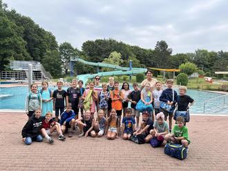 Marla aus der Klasse 3a berichtet vom Schwimmunterricht: Am 26.05.2025 fuhren wir zum ersten Mal zum Schwimmunterricht. Zusammen mit der Klasse 3b sind wir immer montags und donnerstags schwimmen gegangen. Als wir dort ankamen, lernten wir unsere Schwimmlehrer kennen. Sie hießen Herr Peter und Frau Back-Betzwieser und gemeinsam mit Frau Horn führten sie den Schwimmunterricht durch. Dann hieß es ab ins Wasser. Am Anfang war es noch ziemlich kalt. Aber nach dem dritten Mal fanden wir das Wasser richtig toll. Wir trainierten für die Schwimmabzeichen. Beim letzten Schwimmen machten die Kinder ihre Schwimmabzeichen. Und zwar erfolgreich. Einige Schüler machten Seepferdchen, sehr viele Kinder schafften Bronze und sogar Silber. Zwei Kinder wollten noch Gold machen. Leider dauerte Gold zu lange und stattdessen feuerten wir die anderen an. Wir hatten sehr viel Spaß und in der Hitze war das Wasser eine gute Abkühlung. Wir bedanken uns ganz herzlich bei der Verbandsgemeinde, die sowohl die Buskosten als auch die Eintrittsgelder übernommen hat.