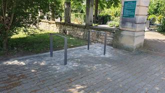 Vor den Eingängen Friedhofs- und Rheinzaberner Straße hat der Bauhof Fahrradständer installiert, an die Besucher ab sofort ihre Fahrräder anschließen können.
