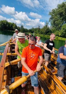 Unsere Reise begann mit einer Oldtimerfahrt über Leimersheim, nach Neupotz zum Lusoria Römerschiff. Unter der Leitung von unserem Guide Dieter erfuhren wir viel über die spannende Bergung des Schiffes in Mainz, das während Bauarbeiten entdeckt wurde. Dieter gab uns interessante Einblicke in den Schiffbau und die Geschichte über das alltägliche Leben der Römer. Rätsel mussten gelöst werden und die richtige Rudertechnik wurde vermittelt. Besonders spannend war es, mehr über die Fortbewegung mit dem Holzschiff zu lernen. Wir erhielten eine Einführung in nautische Begriffe wie Steuerbord, Backbord, Bug, Mitte und Heck. Ein Höhepunkt war das Erleben von historischen Artefakten. Wir durften einen Mammutzahn und römische Schwerter bestaunen. Während der Tour umschifften wir den gesamten See, genossen den Sonnenschein und die erfrischende Brise. Den krönenden Abschluss bildete ein gemeinsames Essen im Anglerheim Neupotz, gefolgt von einer kurzen Moped-Tour zurück nach Hause. Ein unvergessliches Erlebnis! Recht herzlichen Dank an Tobias Wolf für die Organisation.
