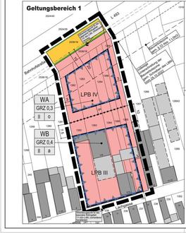 Vorgesehener Geltungsbereich des Bebauungsplans „Zwischen Lachgasse und Bahnhofstraße“, Geltungsbereich 1,, ohne Maßstab