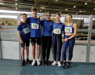 3 Medaillen brachten unsere Nachwuchsläufer von den Landeshallenmeisterschaften in den Altersklassen U16 und U18 mit nach Rülzheim. Tim Müller bewies einmal mehr sein großes Talent auf den Mittelstrecken. Samstags startete er in seiner Ak M15 über die 800m. In einem taktisch clever gelaufenen Rennen mit starkem Endspurt sicherte sich Tim in neuer Bestzeit von 2:17 min den Titel. Sonntags startete er dann hochgemeldet in die U18 über die 1500m. Bei seiner Premiere über diese Distanz und als jüngster Teilnehmer überzeugte Tim in 4:58 min mit einem starken 2.Platz. In der weiblichen Klasse W14 hatte die LG gleich 3 Läuferinnen über die 800m am Start. Ronja Koller lief lange Zeit an der Spitze des Feldes, musste aber in der zweiten Hälfte des Rennens eine Konkurrentin ziehen lassen. In starken 2:41 min verpasste sie ihre Bestzeit nur knapp und belegte den sehr guten 2. Platz. Mia Hahn kämpfte bis zum Schluss um Bronze, musste sich dann aber auf den letzten 200m geschlagen geben. Dafür konnte Mia ihre Bestleistung um 6 Sekunden verbessern und belegte am Ende in 2:45 min Platz 4. Helene Menzer belegte in 3:03 min Platz 5. Hochgemeldet in die M14 belegte Max Müller in 2:45 min Platz 5.