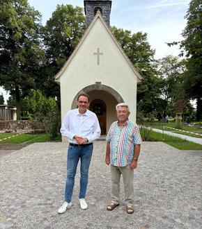 Der Platz vor der Kapelle auf dem Leimersheimer Friedhof wurde neu gestaltet. Möglich wurde dies dank der großzügigen finanziellen Unterstützung von Theo Geiger. Geiger betonte, der vorherige Belag sei in die Jahre gekommen gewesen und durch einzelne hervorstehende Platten auch zur Stolperfalle geworden. Daher habe er sich entschlossen, die Gemeinde finanziell mit rund 30.000 Euro zu unterstützen, um eine Neugestaltung und optische Aufwertung zu ermöglichen. „Da mein Vater zu den Opfern des Zweiten Weltkriegs zählt, habe ich zum Platz beziehungsweise der Kriegergedächtniskappelle einen besonderen Bezug. In unmittelbarer Nähe dazu befindet sich auch das Grab meiner Frau. Irgendwann werde auch ich hier meine letzte Ruhestätte finden.“ Die Vorbereitungen – also die Wege und den Unterbau des Platzes – hat die Gemeinde Leimersheim im Zuge der Umgestaltung des Friedhofs übernommen. Anstelle der Platten erhält der Platz nun eine wassergebundene Oberfläche, wie es sie auch an anderen Stellen des Friedhofs gibt. Zudem wurde eine Stufe an der Kapelle entfernt, die nun leichter zu erreichen ist. Ortsbürgermeister Matthias Schardt dankte Geiger für dessen Engagement. „Theo hat sich schon in seiner aktiven Zeit als Gemeinderat für die Kapelle und den Friedhof eingesetzt. Wir freuen uns sehr, dass es geklappt hat und mit der Neugestaltung auch eine optische Aufwertung einhergeht. Der Platz unterstreicht das Ziel eines parkähnlichen Charakters unseres Friedhofs.“