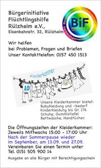 Die Kleiderkammer der Bürgerinitiative für Flüchtlingshilfe ist wieder geöffnet ab dem 13.09. Bis dahin wünscht das Team allen eine gute Sommerzeit. Wer Spaß am Laufen hat und bei einem großen, fröhlichen Wettkampf mitmachen möchte, kann sich für den Vereinslauf am 3. Sept. anmelden. Wenn Du teilnimmst, kann die BiF eine große Gruppe an den Start schicken. Für jedes Alter ist eine passende Distanz dabei. Die Anmeldung und das Startgeld übernimmt der Verein. Wer vorher noch etwas trainieren und sich auf den Wettkampf vorbereiten möchte, kann dies am Samstag, den 26. Aug. tun. Treffpunkt ist um 16:00 Uhr am Läuferhaus an der Festwiese. Auch die Leichtathletikgemeinschaft, LG Rülzheim, bietet ein kostenloses Training für jeden an, der gern Laufen möchte. Dieses findet immer Dienstags um 18 Uhr und Samstag um 16 Uhr statt. Auch hier ist der Treffpunkt am Läuferhaus. Näheres zum Vereinslauf und den Lauftrainings kannst Du erfahren bei unserer Organisatorin, Michaela Geiger, unter der Mobil-Nr. 0151 505 900 14 .
