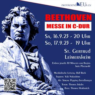 Was für 2020 zum 250. Geburtstag von Ludwig van Beethoven geplant war, wird nun Wirklichkeit! Am 16. und 17.09.2023 wird der Chor zweitausendNEUn in der katholischen Kirche St. Gertrud in Leimersheim die Beethoven Messe in C-Dur aufführen! Ergänzt wird das Programm durch bekannte Werke von Felix Mendelssohn-Bartholdy und Arrangements von Maybebop. Konzertbeginn ist am Samstag um 20:00 Uhr, am Sonntag um 19:00 Uhr. Einlass ist jeweils 30 Minuten vor Beginn. Karten zum Preis von 15 € erhalten Sie bis 15.09.23 bei unseren Vorverkaufsstellen: Bäckerei Schwab in Leimersheim, Bäckerei Reuther in Rülzheim, Brillen-Schöttinger in Kandel oder unter www.chor-2009.de. Abendkasse 17 €, Ermäßigung in Höhe von 7 € für Kinder, Schüler:innen und Student:innen auf den jeweiligen Eintrittspreis. Der Rabatt wird an der Abendkasse ausgezahlt. Ab 12 Jahren ist die Vorlage eines Nachweises erforderlich. Wir freuen uns, Sie bei uns begrüßen zu dürfen.