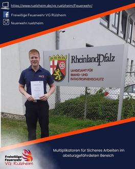 In der vergangenen Woche besuchte Benedikt Lutz (Einheit Hördt) den Lehrgang „Multiplikatoren für Sicheres Arbeiten im absturzgefährdeten Bereich“ am Landesamt für Brand- und Katastrophenschutz in Koblenz.