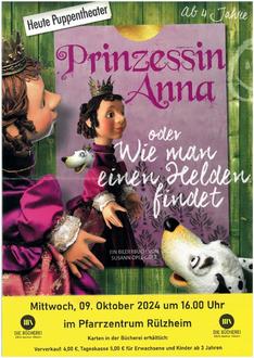 Nachdem im vergangenen Jahr unser Theater „Der Superwurm“ des Puppentheaters „Dornerei“ aus Neustadt ein voller Erfolg war, möchten wir euch auch in diesem Jahr wieder ein Puppentheater anbieten. Am Mittwoch, den 09.10.2024 um 16:00 Uhr gastiert die „Dornerei“ erneut bei uns mit Ihrem neuen Stück „Prinzessin Anna oder Wie man einen Helden findet“ im katholischen Pfarrzentrum Rülzheim. Dieses Stück ist für kleine und große Kinder ab 4 Jahren, und nicht nur für Mädchen, geeignet. Es ist eine ganz neue Geschichte, die man in keinem alten Märchenbuch finden kann. Um das ganze Königreich von ihrem Vater zu erben, soll Prinzessin Anna einen Helden finden. Doch das ist gar nicht so einfach wie es in den Märchenbüchern steht. Prinzessin Annabelle baut einen hohen Turm aus Matratzen, bastelt lustige Zwerge und küsst am Schlossteich einen Frosch. Aber alle Bemühungen bleiben erfolglos. Doch dann wagt sich Anna weit hinaus und trifft ihren wahren Helden: Er heißt Jakob und ist … Puppenspieler! Neben Prinzessin Anna und Jakob spielen in dieser Geschichte mit: Ein König im Ruhestand und seine Köchin Maria, der lustige Hund Schnuppi, Annas hilfsbereite Amme namens Moldau, Herr und Frau Frosch und am Schluss schauen sogar die kompletten sieben Zwerge vorbei. Karten sind ab sofort für 4,00 € (Tageskasse: 5,00 €) in der Bücherei erhältlich. Kinder unter 3 Jahren sind frei!