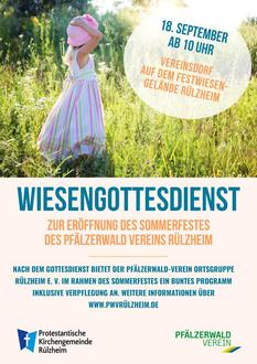 10:00 Uhr Wiesengottesdienst zur Eröffnung des Sommerfestes des Pfälzerwald Vereins Rülzheim im Vereinsdorf auf dem Festwiesengelände. Der Gottesdienst wird musikalisch vom Musikverein Rülzheim begleitet, Pfr. Jan Meckler