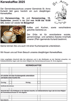 Die Abgabe / Annahme von Kuchenspenden für den diesjährigen Kerwekaffee ist sowohl sonntags als auch montags ab 12:45 Uhr im Bürgerhof des Gemeindehauses möglich.