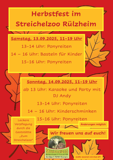 Am kommenden Wochenende findet jeweils von 11-19 Uhr unser Herbstfest im Streichelzoo statt. Am Samstag, 13.09.2025, von 13-14 Uhr gibt es Ponyreiten. Von 14-16 Uhr dürfen sich die Kinder beim Basteln vergnügen. Von 15-16 Uhr findet erneut das Ponyreiten statt. Am Sonntag, den 14.09.2025, freuen wir uns ab 13 Uhr auf Karaoke und Party mit DJ Andy. Anschließend dürfen die kleinen Besucherinnen und Besucher von 13-14 und von 15-16 Uhr erneut auf den Ponys reiten. Von 14-16 Uhr wird Kinderschminken angeboten. Änderungen im Programm sind möglich. Leckere Verpflegung bietet die Gaststätte „Zum Streichelzoo“. Wir freuen uns auf zwei bunte herbstliche Tage und viele kleine und große Besucherinnen und Besucher!