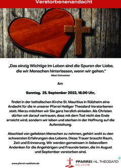 Rülzheim, 10:30 Uhr Festgottesdienst zum Patronatsfest St. Mauritius - mitgestaltet vom Kirchenchor; ab 11:30 Uhr Kuchenverkauf der kfd im Pfarrzentrum; ab 13:00 Uhr Cafeteria im Pfarrzentrum; 18:00 Uhr Andacht für die Verstorbenen der Monate August und September