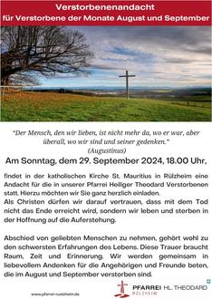 | Rülzheim, | 18:00 | Uhr Andacht für die Verstorbenen der Monate August und September |