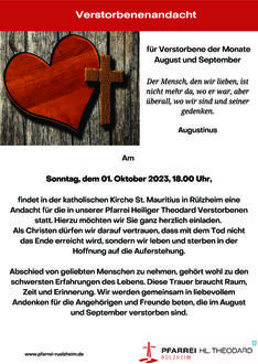 | 18:00 Uhr | Andacht für die Verstorbenen der Monate August und September | |