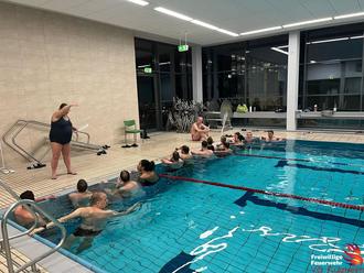 An den vergangenen beiden Freitagen legten 25 Kamerad*innen der Verbandsgemeindefeuerwehr das Schwimmabzeichen in Bronze und Gold ab. Zukünftig werden wir dies regelmäßig wiederholen, sodass alle Kamerad*innen unsere Feuerwehr das Abzeichen ablegen. Wir bedanken uns herzlich bei der Verbandsgemeinde Lingenfeld für die Bereitstellung des Hallenbades und unseren Ausbildern der DLRG Wörth, Carmen Back-Betzwieser, Katharina Back, Sophie Becker und Hans Jürgen Peter. “Es ist wichtig, dass unsere Kamerad*innen sicher bei Arbeiten Am- und Im Gewässer sind und daher lege ich Wert auf einen Schwimmnachweis”, so Wehrleiter Andreas Leingang.