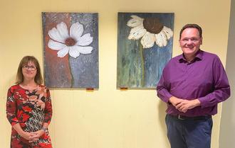 Das Foto zeigt die Ausstellerin und Bürgermeister Matthias Schardt vor den Bildern „Margeriten“.
