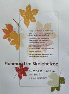 Diesen Samstag, den 7. Oktober 2023 von 11-17 Uhr findet unser erster Flohmarkt im Streichelzoo Rülzheim statt. Bitte beachten Sie die Datumsänderung. Der Aufbau ist ab 10 Uhr möglich und die Tische sind selbst mitzubringen. Pro laufendem Meter Tisch 5 € Spende an den Zoo. Wir bitten um Voranmeldung direkt bei Mario Muth (Tel. 0152 53731008). Die Anmeldung ist erst nach der Überweisung der Spende unter vollständigem Namen gültig. Spendenkonto: Kleintierzuchtverein P111 e.V., VR Bank Südpfalz, IBAN: DE72 5486 2500 0000 0518 88. Wir freuen uns auf einen tollen Flohmarkttag mit euch!