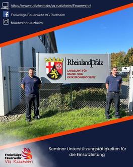 Manuel Essert und Lars Guldenschuh (Einheit Rülzheim) besuchten im Zeitraum vom 30.09. bis 02.10. das Seminar Unterstützungstätigkeiten für die Einsatzleitung am LfBK in Koblenz. Bei Einsätzen größeren Umfanges ist die Unterstützung von Führungseinheiten und Führungseinrichtungen notwendig und sinnvoll. Führungshilfspersonal sind Einsatzkräfte, die in den Führungseinheiten und Führungseinrichtungen als Sprechfunker, Fernsprecher, Einsatztagebuch- oder Lagenkartenführer sowie für vergleichbare Tätigkeiten eingesetzt werden. Im Rahmen des Seminars werden die Möglichkeiten zur Umsetzung der Vorgaben aus der DV 100, der taktischen Zeichen und der FüRi-RLP aufgezeigt und in praxisgerechte Übungen umgesetzt. Weitere Themen waren Kommunikation und Informationsfluss im Führungsdienst und Anwendung von Kommunikations- und Informationsmitteln. Unsere Kameraden haben das Seminar erfolgreich abgeschlossen.